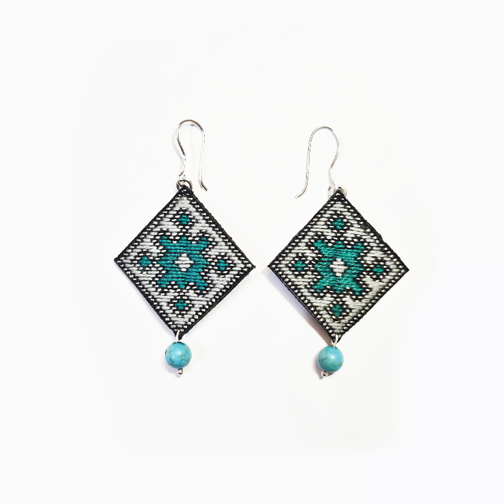 If you are looking for a unique, artistic and culturally inspired accessory, these handmade turquoise earrings are the perfect choice for you. Their diamond-shaped design features traditional motifs from authentic Iranian kilims and embroidery, combined with the soothing and eye-catching turquoise color to create a different and unique effect.